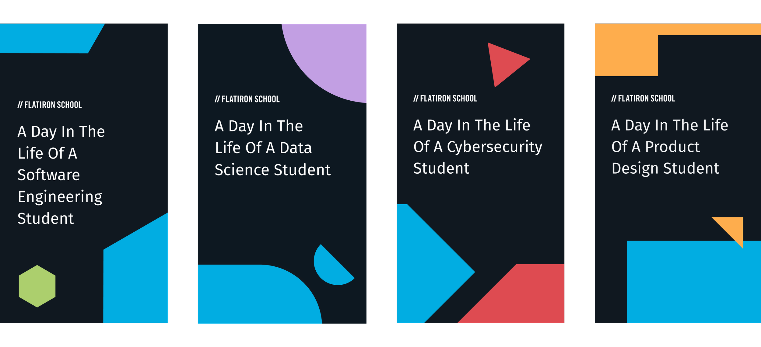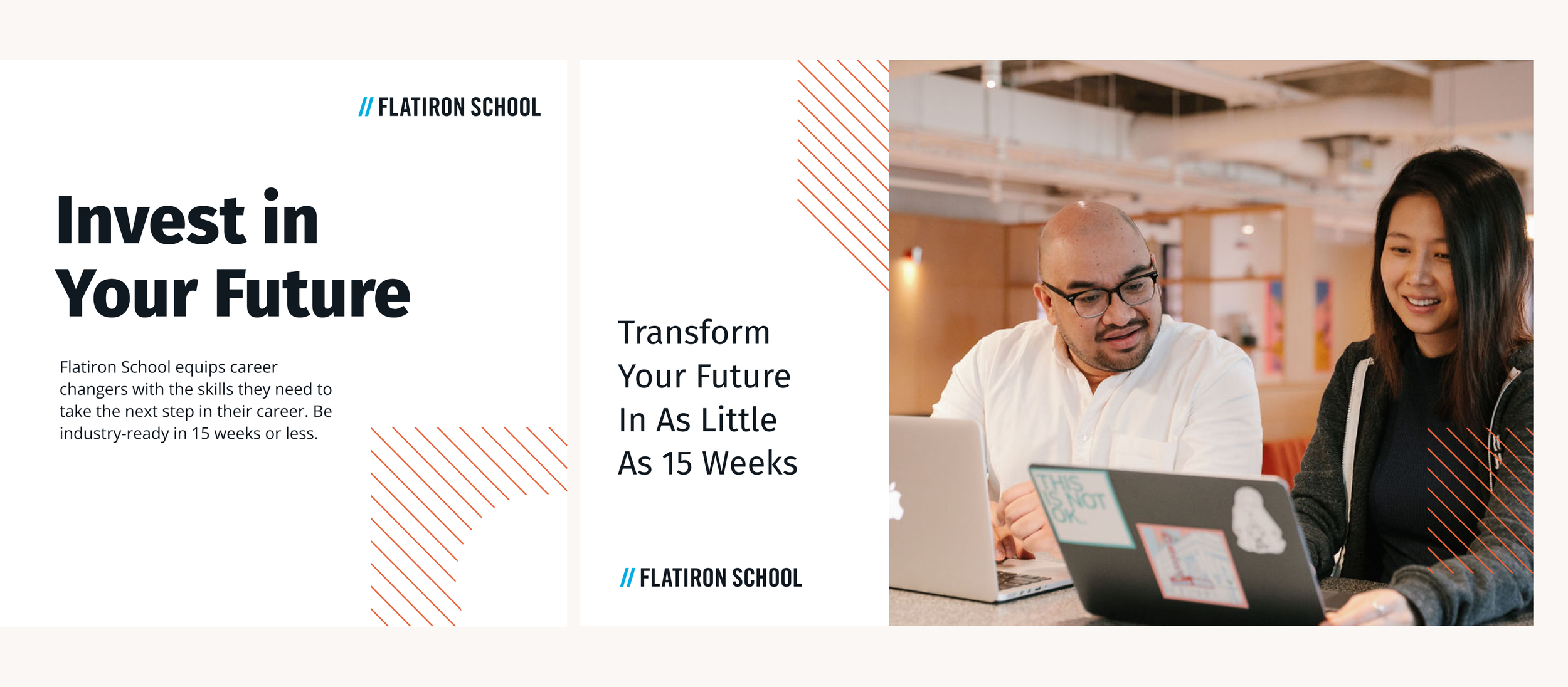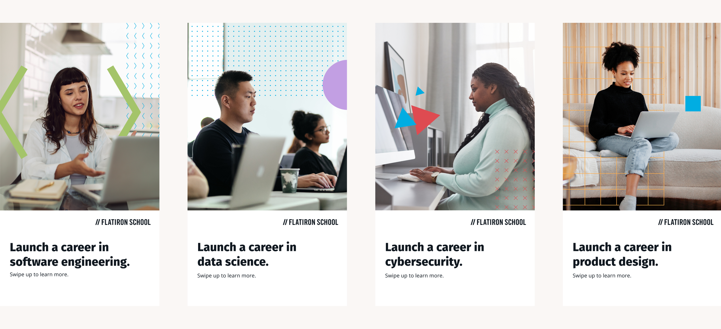 Visuals put the brand voice - Flatiron School’s determination, ambition, and expertise - into a visible format. They highlight diversity and authenticity in our visuals, featuring open spaces and forward motion.