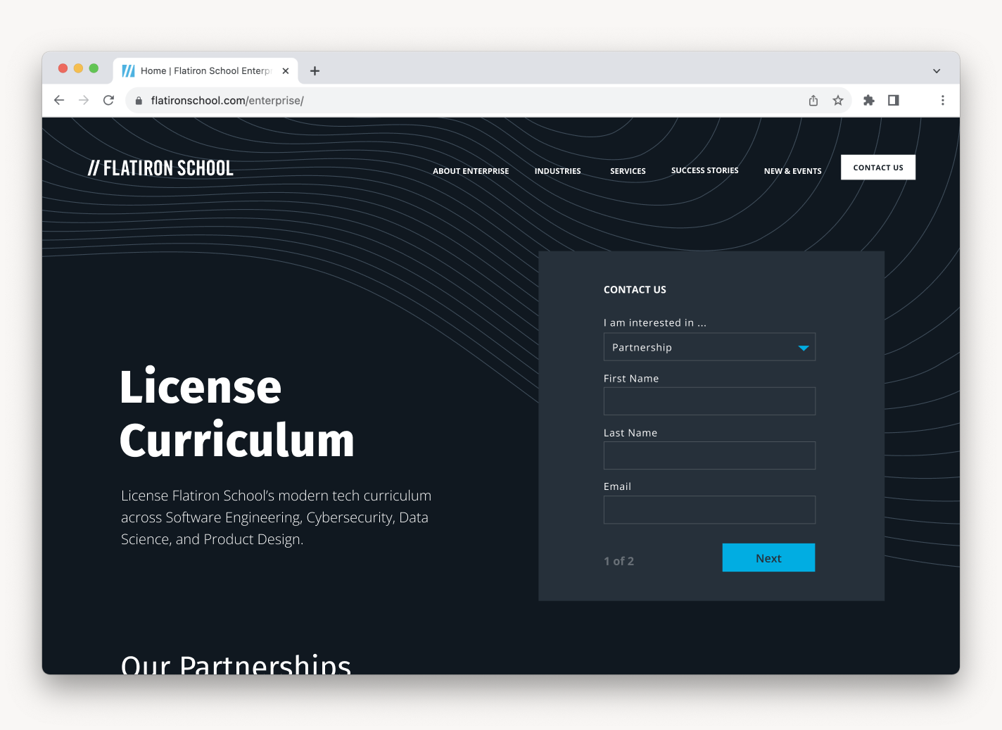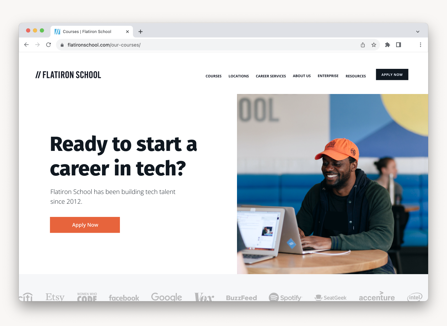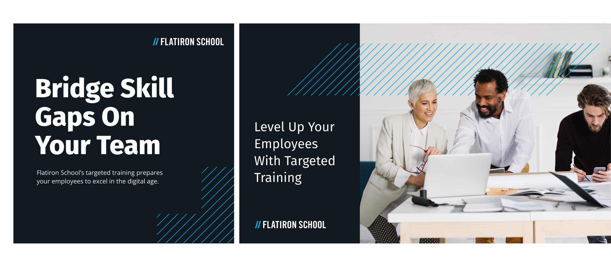 Visuals put the brand voice - Flatiron School’s determination, ambition, and expertise - into a visible format. They highlight diversity and authenticity in our visuals, featuring open spaces and forward motion.