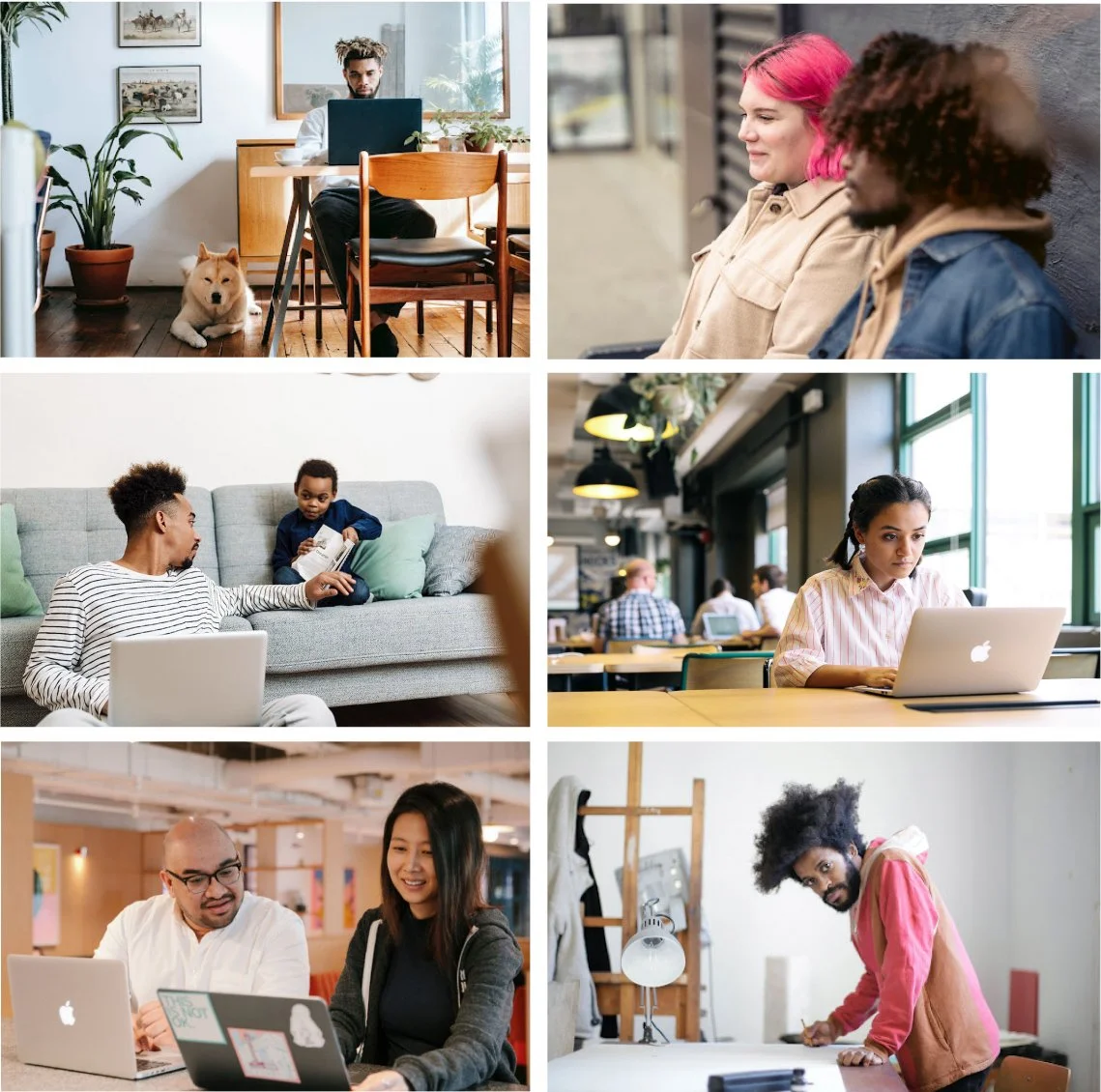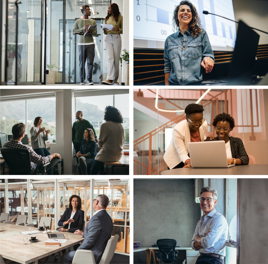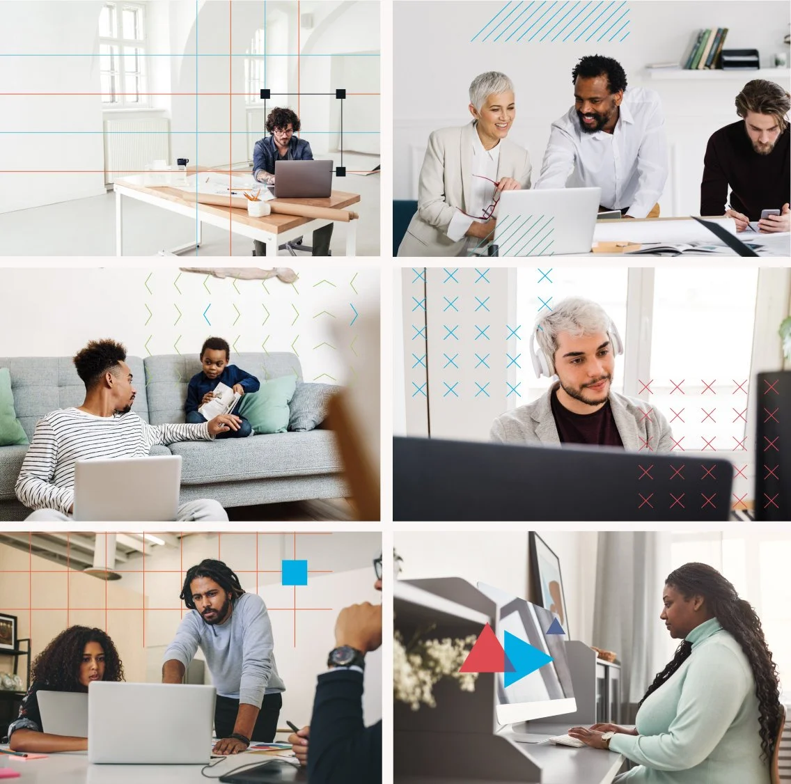Enterprise takes a similar tone to universal, with light, neutral tones and authentic poses. Enterprise photography slants towards a high-tech, professional setting, with employees dressed in business casual attire. The colors are neutral with subtly contrasting cool tones.