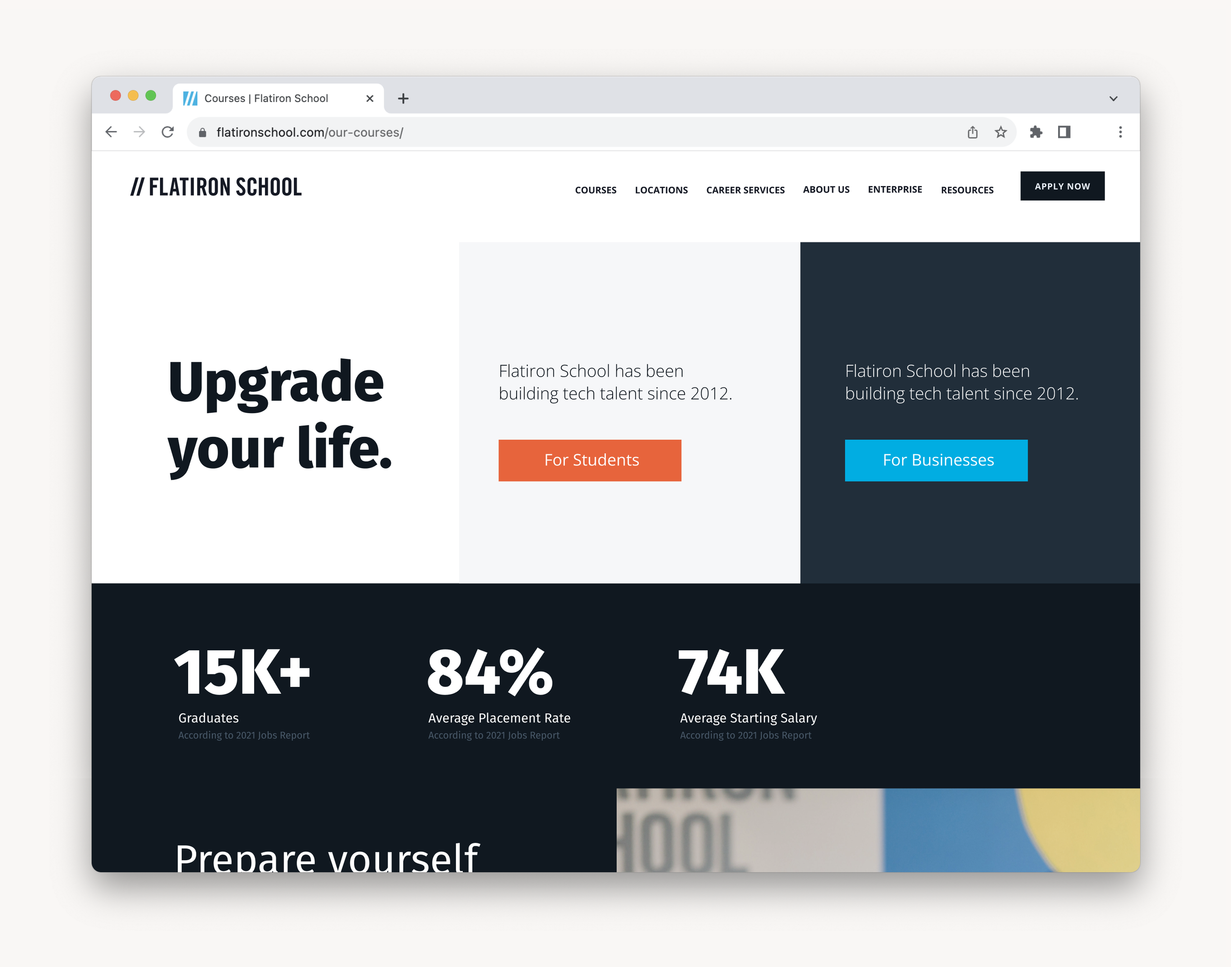 We used competitive analysis, analytics, and interviews to identify areas of improvement and inform design decisions. Interviews with active students and alumni revealed a disconnect with existing visual elements and how the brand was perceived. We started by revisiting and bolstering our brand values for refreshing core elements of the brand.