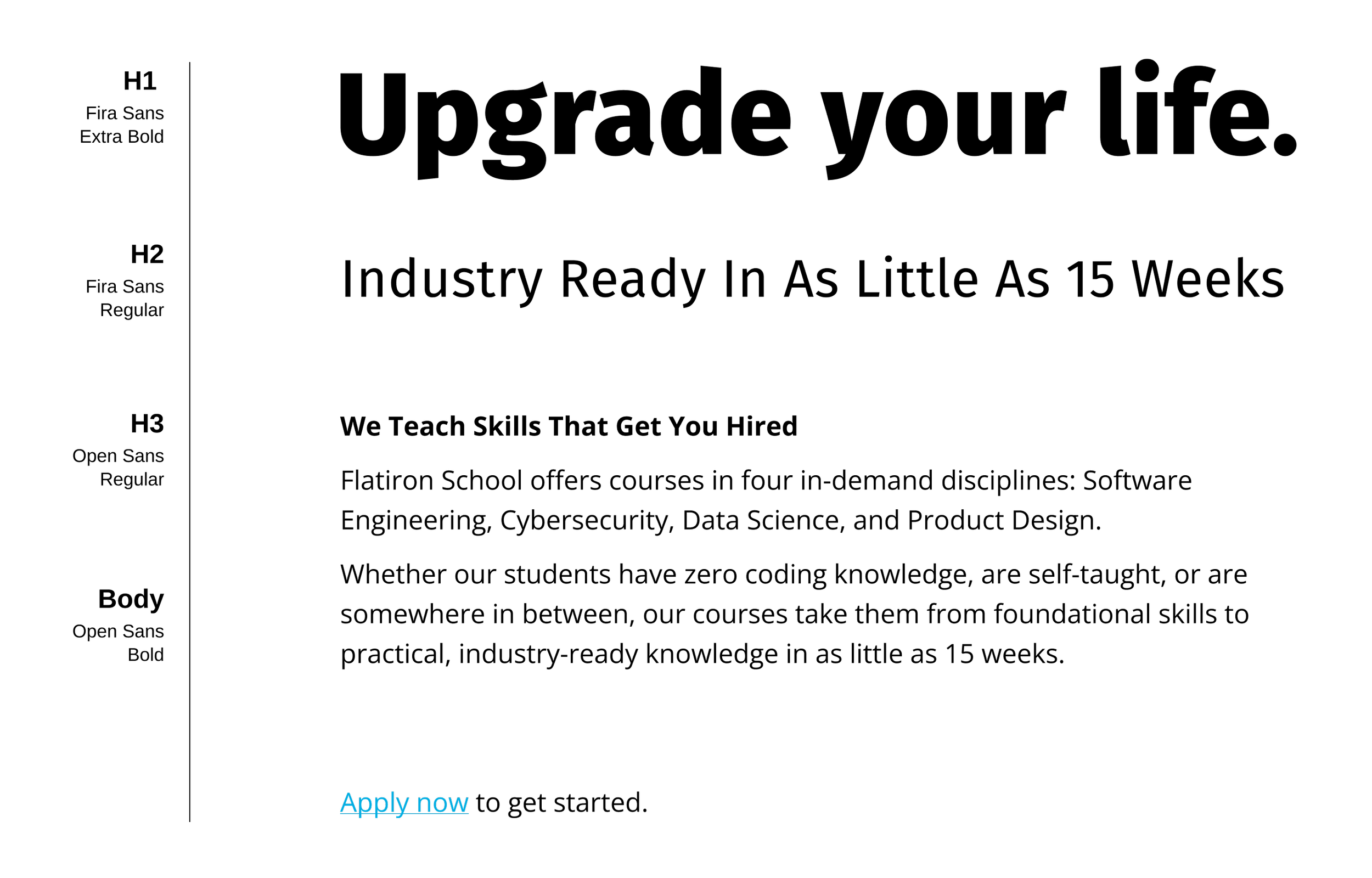 An updated blue is is present through all palettes as the core brand color. Blue has been the primary brand color since Flatiron’s School’s founding in 2012 and allows the palette to lean into legacy while continuing to expand and grow.