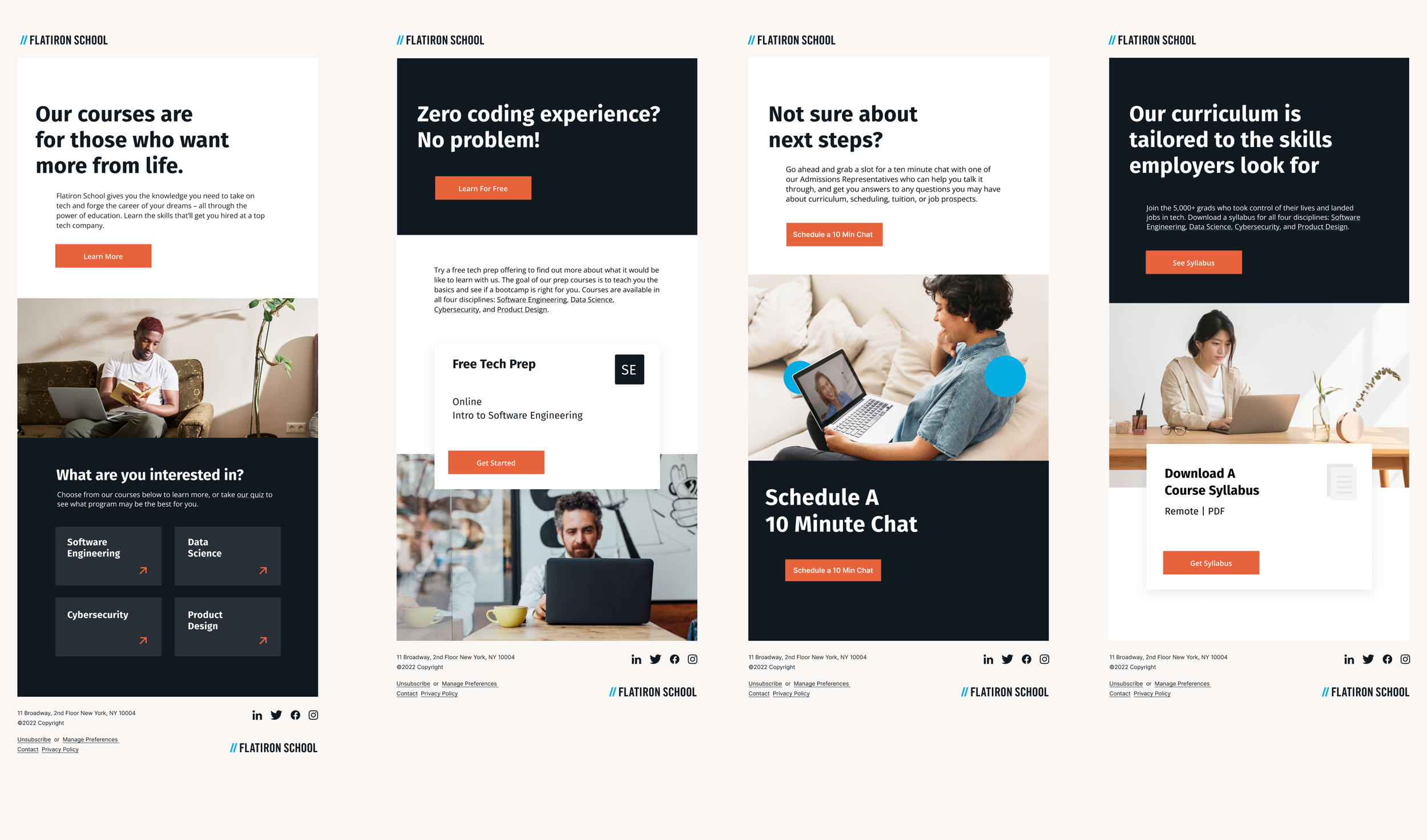Visuals put the brand voice - Flatiron School’s determination, ambition, and expertise - into a visible format. They highlight diversity and authenticity in our visuals, featuring open spaces and forward motion, our mission made real.